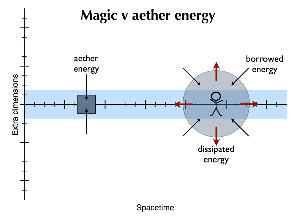 Voor de uitgebreide uitleg van etherenergie verwijs ik graag naar dit interview van Niamh met Kate dat helaas de uiteindelijke versie van Magnetar niet gehaald heeft. (Klik hier voor de PDF.) Kort gezegd komt het erop neer dat etherenergie de ‘mechanische versie’ van magie is: er wordt energie onttrokken aan het gebied buiten ons braan (Energy Space of de ‘ether’).