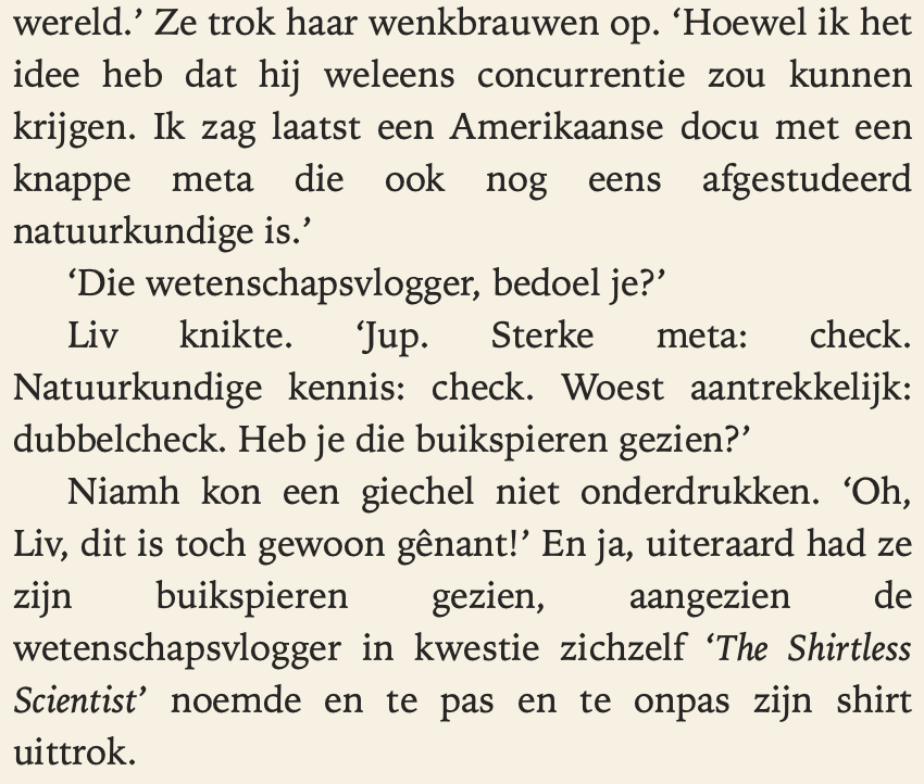 De reacties waren zodanig dat ik het vervolgens toch maar wél heb ingevoegd. Het bleek vervolgens echt perfect te passen. Cassie heeft nu nog meer reden om op het eerste gezicht een hekel aan het personage in kwestie te hebben en Max (de voormalige Luuk) meer reden om hem interessant te vinden. En The Shirtless Scientist loste ook meteen een probleem op waar ik tot dusver alleen vrij onwaarschijnlijke oplossingen voor had bedacht.