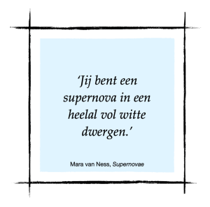 Maar voor nu wil ik wel alvast een paar stukjes delen! Supernovae (te midden van witte dwergen) is minder cosy dan Magnetar en Singulariteit maar valt zeker wel onder het genre ‘romantische SF’. (Niet geheel verrassend, als ik het in wil sturen voor een Valentijnskalender, haha.) In tegenstelling tot het tweeluik (dat in de derde persoon v.t. geschreven is), is Supernovae in de eerste persoon geschreven. Dat vond ik voor zo’n relatief kort verhaal beter werken. In het verhaal (inmiddels een novelle) leer je een aantal personages uit Magnetar kennen in hun jonge(re) jaren en zie je hoe ‘etherenergie’ ontwikkeld is.