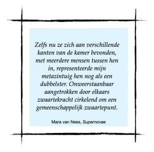 Ik sloot mijn ogen en genoot van het gevoel van de zon op mijn gezicht. Zo met mijn ogen dicht, was het altijd of mijn metazintuig scherper zag. De mensen die door het park wandelden, nam ik waar als een soort kleine sterren. Kasper en vooral Leander, echter, brandden als supernova’s.